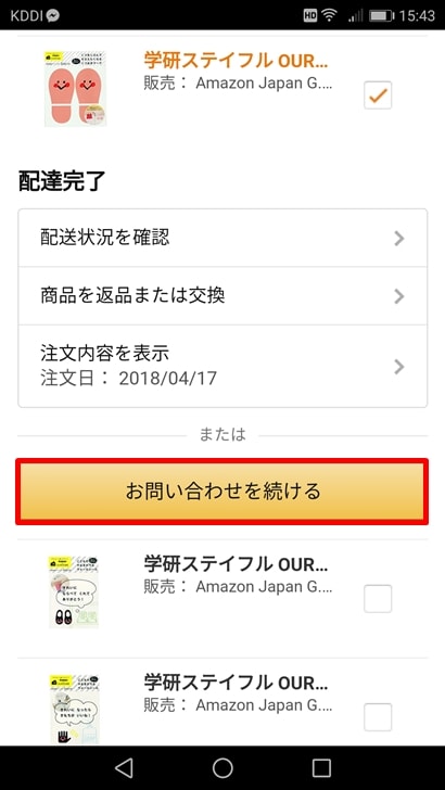 ▼届かなかった商品すべてを選んだあと、『お問い合わせを続ける』をタップです。