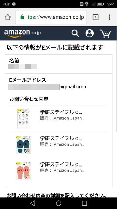 ▼『以下の情報がEメールに記載されます』のページが表示され、名前やEメールアドレス、選んだ商品が確認のために出てきますよ。
