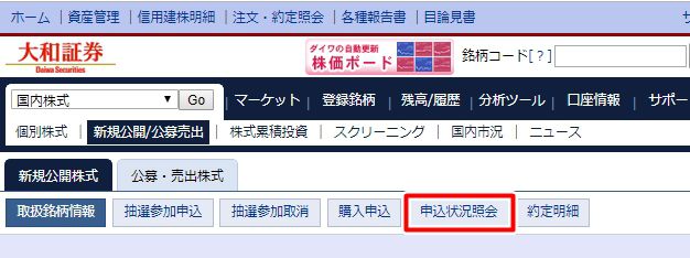 ▼トップページの「新規公開/公募売出」メニューから、「申込状況照会」ボタンを押しましょう。