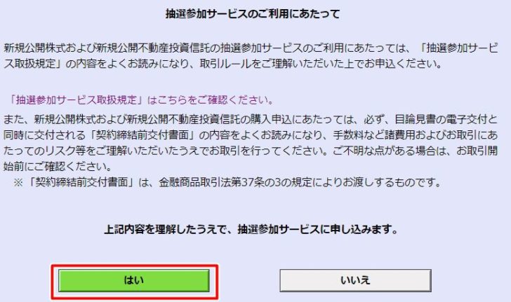 ▼抽選サービス取扱規定の内容を確認したら、「はい」ボタンを押します。